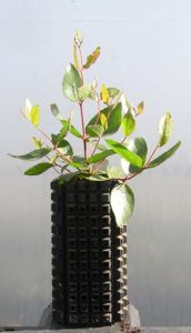 Plant size at the time of planting out will depend on species and the natural conformation of the plant. For many Eucalypts, calliper measured at 10% of the height should be between 1.5 – 2% of the tree height. E.G. a 400mm tall Corymbia maculata should have a calliper of between 6 – 8mm.